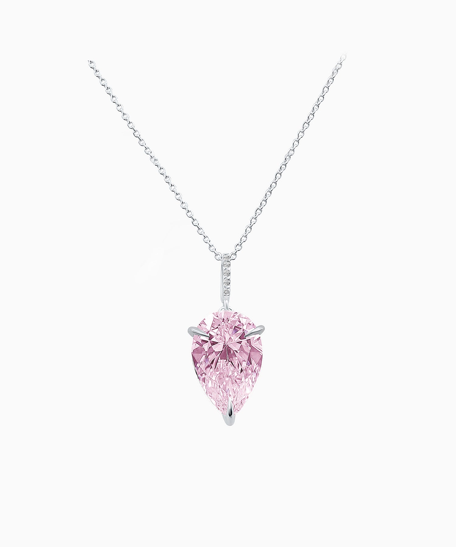 An elegant and delicate pendant in a graceful pear shape. The centerpiece features a hand-cut Fancy Pink Fabulite — a refined imitation of a pink diamond.