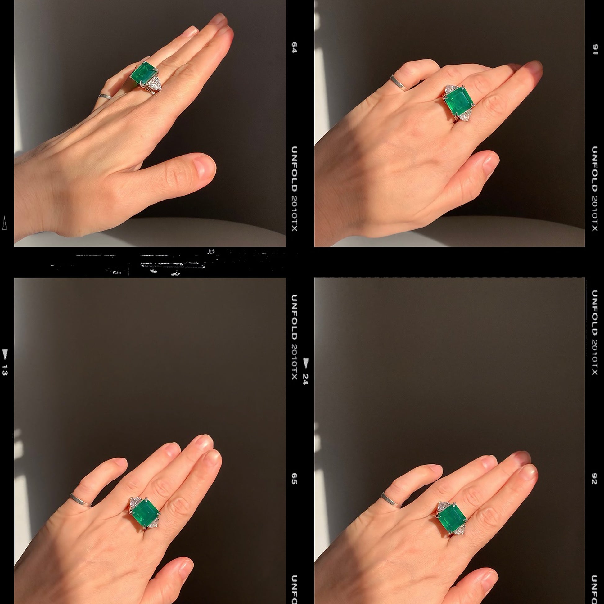 A refined silver ring featuring a deep dark-green emerald quartz that mesmerizes with its rich color and depth, reminiscent of a genuine Colombian emerald. The central stone is framed by two clear cubic zirconia accents, enhancing its brilliance and noble allure.