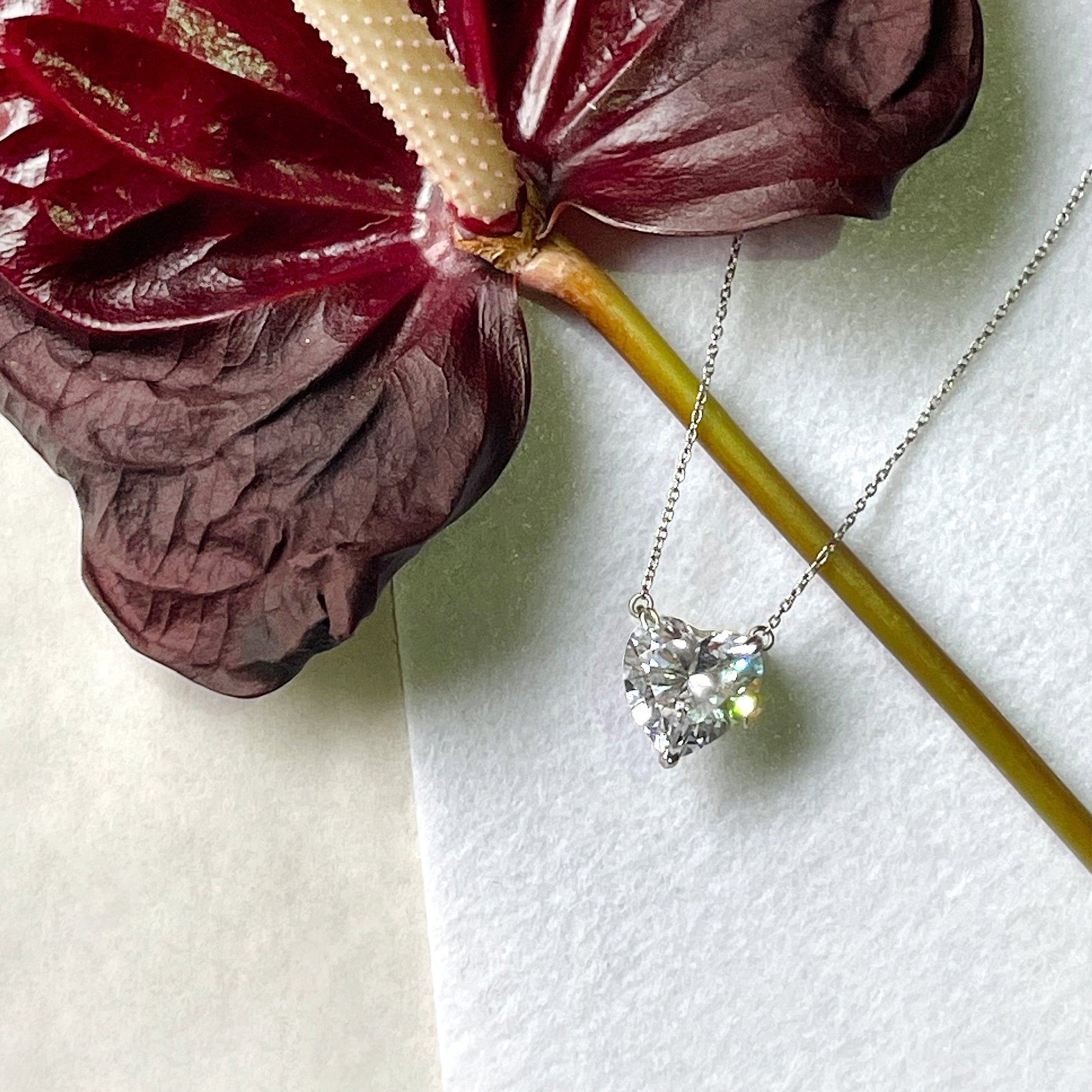 An elegant silver necklace featuring a heart-cut fabulite as its centerpiece — a symbol of refined romance and timeless grace. The stone’s hand-cut facets create a captivating play of light, revealing its clarity and brilliance. A delicate, movable pear-shaped drop positioned to the side adds a dynamic, contemporary accent and a touch of individuality.