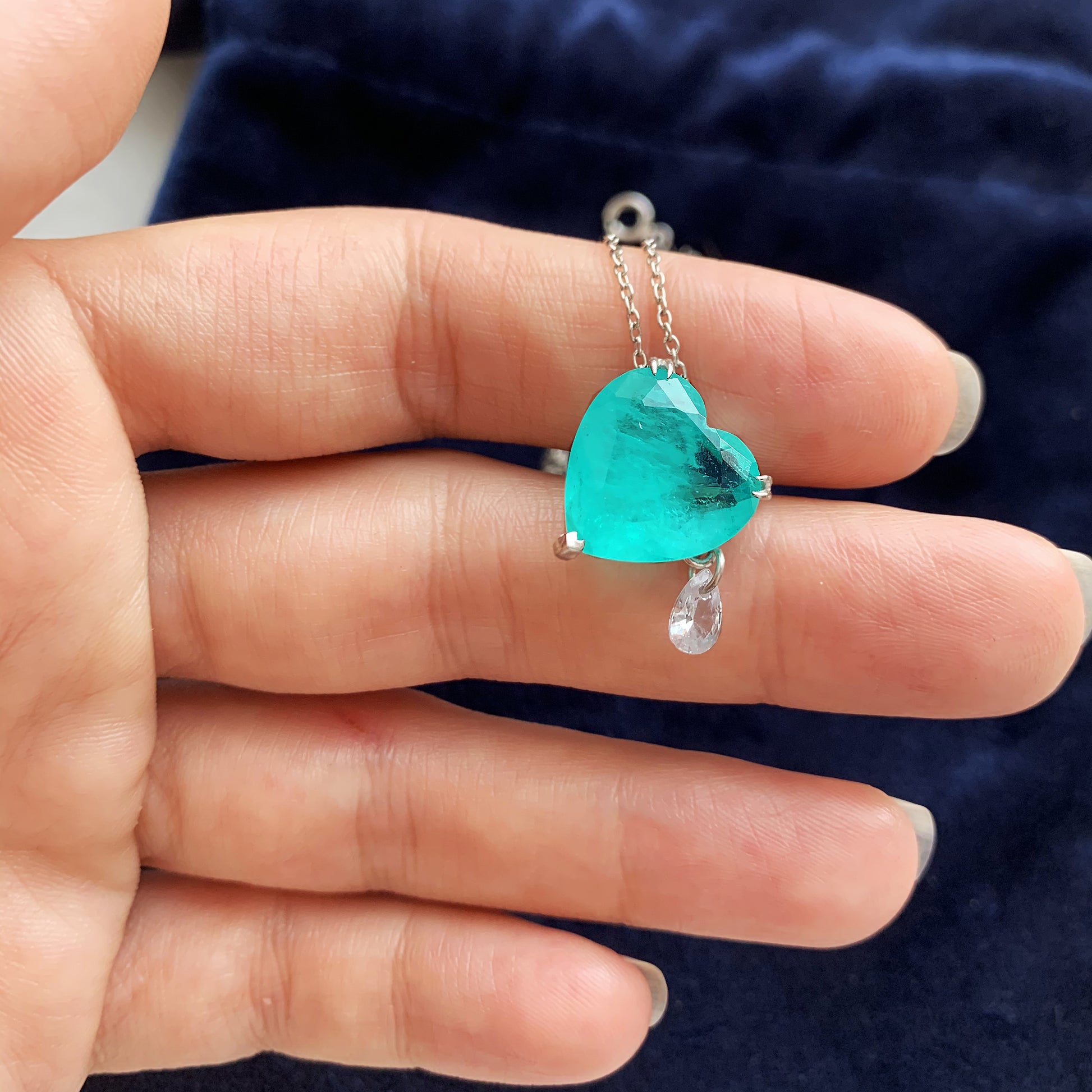 An elegant silver necklace featuring a heart-shaped Paraiba tourmaline quartz in a rich turquoise hue reminiscent of the ocean. The vivid central stone is paired with a delicate, movable pear-cut drop that adds a sense of movement and refined grace.